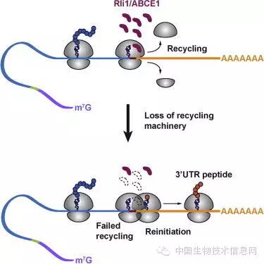 在发表于8月13日《细胞》(Cell)杂志上的研究论文中,约翰霍普金斯大学医学院分子生物学与遗传学教授Rachel Green博士和研究小组总结了她们的酵母细胞研究结果,报告称当核糖体到达mRNA的“终止”信号处而无法被“回收利用”时就会发生这种非典型的蛋白质合成。Green说,原因尚不清楚,“淘气”的核糖体在没有“启动”信号的情况下重启,生成了一些功能未知的小蛋白。