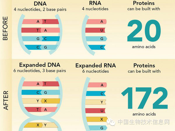 有学者制造出除G-C和A-T以外的新的核苷酸,现在已经将这些新的核苷酸转入活的细菌基因组内,将来可利用这种技术编码新的氨基酸和全新的蛋白质,这种技术有可能成为人工新蛋白的工厂。