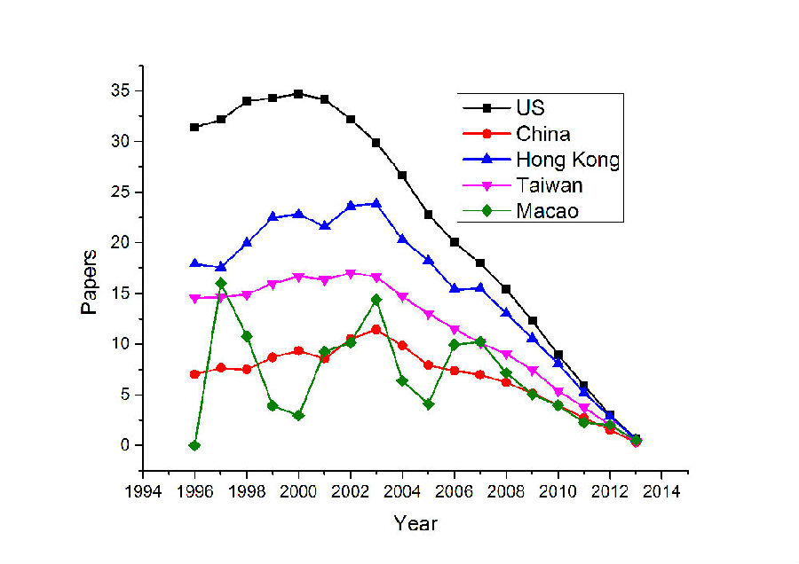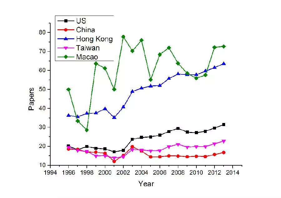 平均被引频次还是偏低,大陆地区与澳门地区基本相当。显然与论文数量发展不相称,在注重提高质量可能要比追求是量更重要。