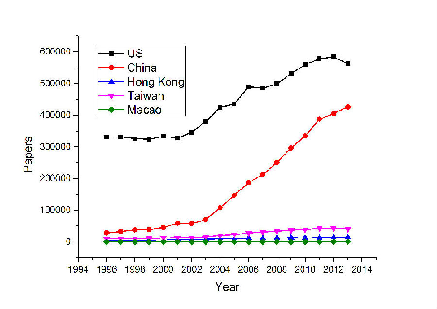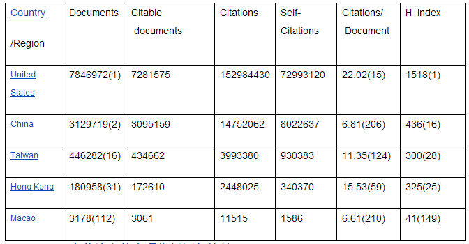 根据Scopus?1996~2013年的统计结果,论文数量的确是我国仅次于美国(7846972篇),数量达到3760137篇,其中大陆地区3129719篇,台湾地区446282篇,香港地区180958篇,澳门地区3178篇;但是篇均被引频次,美国排名第15名,22.02次/篇;我国香港地区排名第59名,篇均被引15.53次/篇;台湾地区排名第124名,篇均被引11.35次;大陆地区和澳门地区不相上下,平均被引分别为6.81次/篇和6.61次/篇,排名分别是206名和210名。H指数排名美国第一;大陆地区第16名,香港地区和台湾地区分别是第25和第28名,澳门地区排名第149名,详见表1。