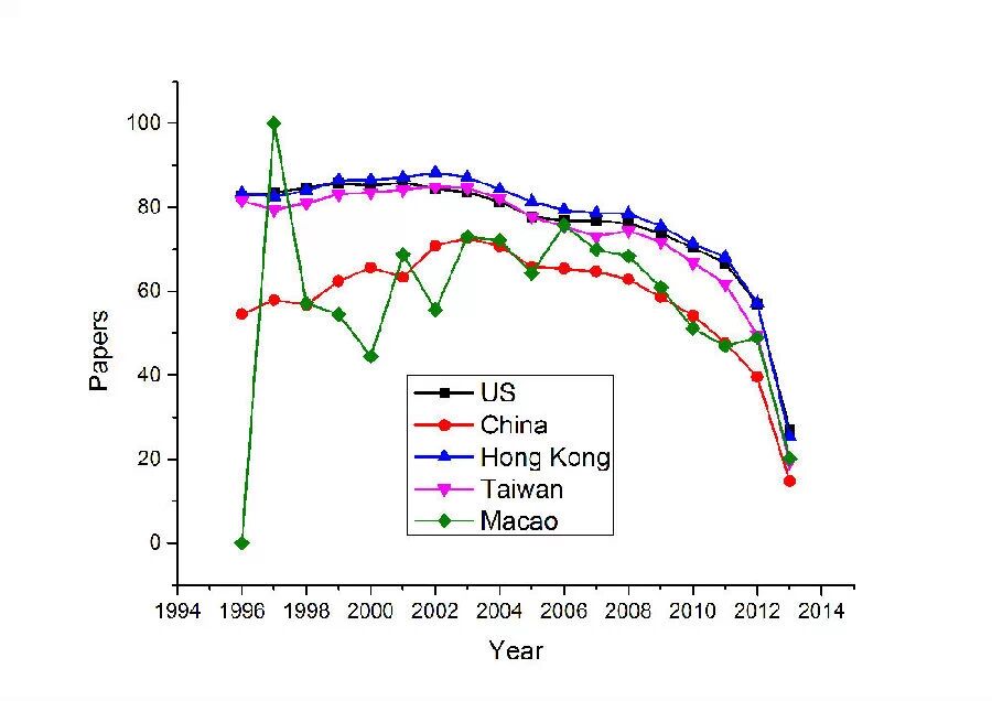 1996~2013年中美论文的多项指标逐年比较结果分别图示如下: