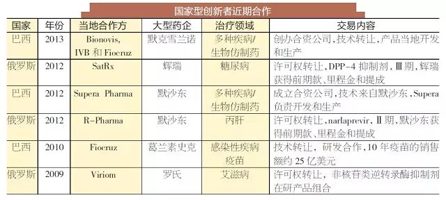 巴西:巴西把合作作为技术转化、人才储备和培养专业知识的主要机制。截至2013年6月,共有87 个项目在巴西实施。以疫苗领域为例,Fiocruz和葛兰素史克就肺炎疫苗Synflorix的技术转让和美洲锥虫病和登革热疫苗的研发达成价值约25亿美元的合作协议。同样,在生物药领域,巴西通过投资一些项目开发生物类似药,以达到转化技术和培养专业人才的目的。这些合资企业都需要跨国公司作为合作伙伴,实施技术转让、细胞系开发、工艺改进以及巴西本土生产。最近巴西还推出一个雄心勃勃的项目——科学无国界,用于资助博士生、博士后和研究人员。政府每年将挑选几百到数千名学生、研究人员和博士后,资助他们去美国或欧洲进修6——24个月,获得生命科学领域研究和新药发现方面的经验,并把这些经验带回巴西。