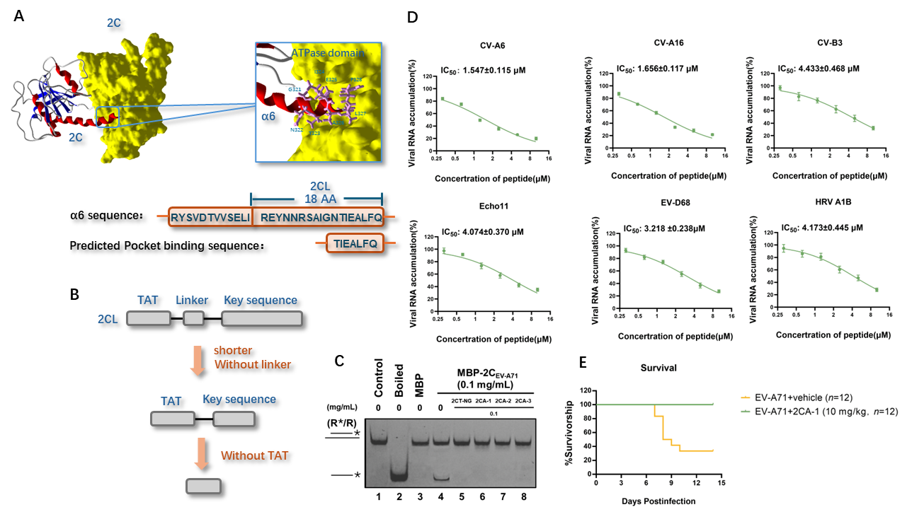 在这些研究的基础上,研究团队基于对2C蛋白“锁孔”样寡聚化界面的精确解析,通过系统性截短与修饰,最终设计并合成了不含细胞穿膜肽、结构精简的拟肽2CA-1。分子对接及体外解旋实验证实,2CA-1能精准嵌入EV-A71以及B组柯萨奇病毒CV-B3 2C蛋白的“锁孔”口袋,并显著抑制2C蛋白的解旋酶活性,同时在细胞水平上展现出针对A组(EV-A71、CV-A16、CV-A6)、B组(CV-B3、Echo11)、D组(EV-D68)肠道病毒以及鼻病毒(HRV)高效的广谱抗病毒活性,并在EV-A71感染的小鼠模型中展现了良好的口服生物利用度与抗病毒效果。
