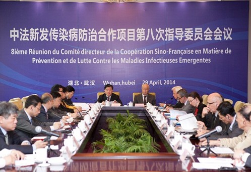 4月29日,中法新发传染病防治合作项目导委员会第八次指会议在武汉召开,就进一步推进武汉郑店实验室建设进行专题讨论。指导委员会中方主席全国人大常委会副委员长陈竺、法方主席法国梅里埃生物集团总裁Alain Mérieux先生、中方项目协调员国家卫生计生委国际司司长任明辉、法国项目协调员Jean-Michel Hubert先生、中国科学院副院长张亚平以及国家外交部、中国合格评定国家认可委员会等指导委员会成员单位代表、法国驻华大使馆及驻武汉总领事馆官员、湖北省人大常委会及人民政府领导等40余人出席了会议。会议由任明辉主持,中科院武汉病毒研究所、中国电子系统工程总公司、中国中元国际工程有限公司等实验室建设、设计、施工单位成员参加了讨论。